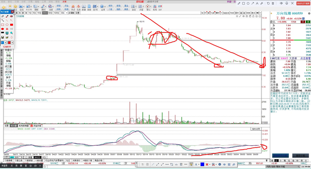 ·现在没有底分型之前还是多看少动,如果想抄底,向下能看到的目标点位最后的一个小中枢的位置是在这,所以暂且不一定能跌到这,先暂且先放到这个位置附近,大概是在六块七位置附近看一看,最好是能够快速下跌,因为本来已经跌不动了,未来再快速下跌就容易产生小转大向上,到时候看一下它是否会产生小转大。